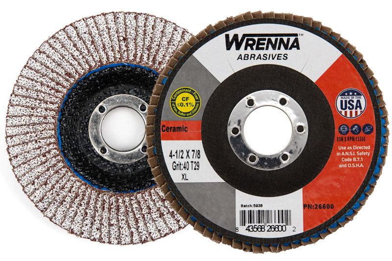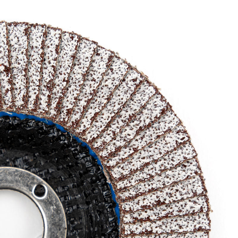Our Wrenna Abrasives® 4-1/2" X 7/8" High Density Flap Disc for aluminum is designed with a tough polyester heat-treated backing, and a high quality aluminum oxide grain featuring 2nd tier calcium stearate to help reduce material build-up between grains. This product is ideal for Aluminum, non-ferrous metals, and blending stainless steel, keeping the material cooler and reducing the likelihood of loading.